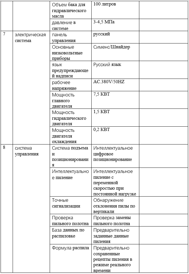 Гидравлическая передающая система состоит из гидравлического контура, включающего насос, клапаны, гидроцилиндры, масляный бак, трубопроводы и интегрированный блок. Под электрическим управлением реализуются подъем и опускание пильной рамы, зажим заготовки, подача и возврат материала.
