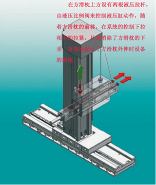 Над прямоугольной бабкой установлены два гидравлических тяговых стержня, действие гидроцилиндров контролируется гидравлическим пропорциональным клапаном. По мере продвижения бабки вперёд, система управляет соответствующей натяжкой, что устраняет прогиб бабки. Это эффективно поддерживает точность оборудования при выдвижении прямоугольной бабки.