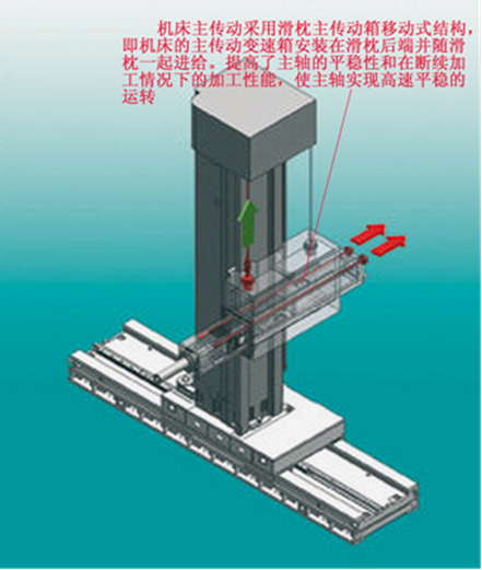 Главный привод станка выполнен по схеме с подвижной коробкой главного привода, то есть коробка передач главного привода установлена на задней части бабки и перемещается вместе с ней. Это повышает стабильность шпинделя и его производительность при прерывистой обработке. Изоляция главной коробки передач от направляющих колонны снижает влияние повышения температуры на точность направляющих колонны и способствует централизованному охлаждению системы главного привода, уменьшая термическую деформацию станка. Коробка передач является независимым модулем, что упрощает обработку и обеспечивает более высокую точность обработки. Все шестерни внутри коробки имеют высокоточную закаленную зубчатую поверхность, что устраняет необходимость перемещения коробки по длинному шлицевому валу, благодаря чему станок обладает более стабильной производительностью, низким уровнем шума и может обеспечить высокоскоростное вращение шпинделя, что увеличивает производительность станка.