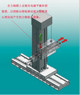 На шпиндельной коробке установлено электрогидравлическое компенсационное устройство для устранения явления наклона шпинделя, вызываемого изменением центра тяжести шпиндельной коробки при перемещении бабки.